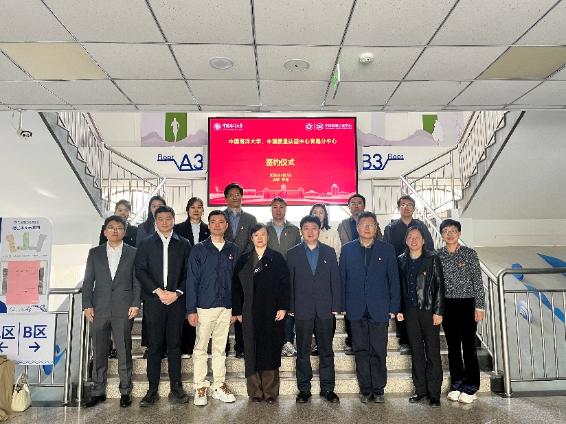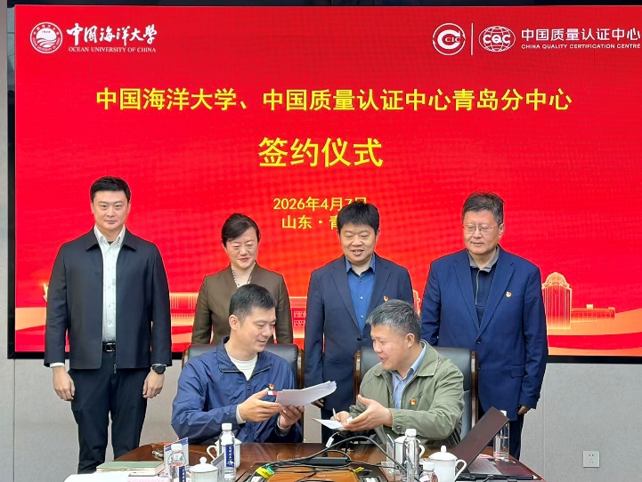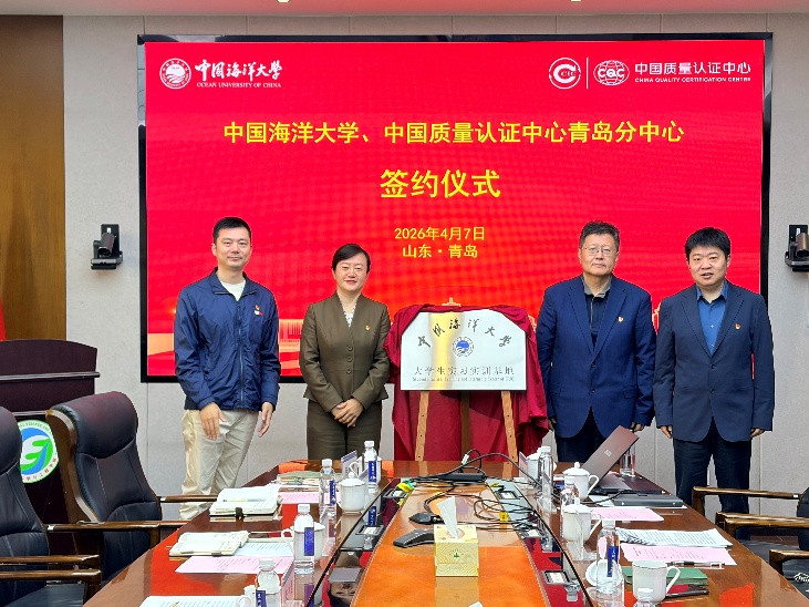 2026年4月7日上午,中国海洋大学环境科学与工程学院与中国质量认证中心青岛分中心在环科楼A213会议室举行共建大学生实习实训基地签约暨揭牌仪式。中国质量认证中心青岛分中心党支部书记兼经理张少君、党支部组织委员兼创新标准部部长袁征、环境科学与工程学院党委书记邵长江、院长江文胜、副院长赵阳国、环境科学系主任田伟君等人出席仪式。